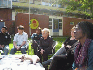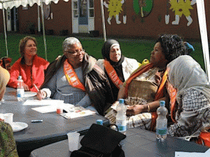 Naast het team De Schuttertjes waren ook de dames van de Vrouwenbazaar (Amsterdam-Noord) aan het woord die allen een prachtige sjerp droegen met daarop het land van herkomst. Iedere dame van de Vrouwenbazaar vertelde over haar betrokkenheid bij de Vrouwenbazaar, n met hoeveel plezier zij dit tot een succes hebben gebracht. En van de vragen aan hen was: “Wat is volgens de dames van de bazaar de beste manier om vrouwen van andere culturen te bereikenSamar benadrukte nogmaals: “Ons kan je het beste persoonlijk benaderen. Pak de telefoon of kom langs. E-mail of een brief is een t onpersoonlijk en afstandelijk middel voor ons. Maar ook wij doen mee met de westerse stijl van het maken van folders en visitekaartjes.” Samar haalt trots de kleurrijke folders van de Vrouwenbazaar tevoorschijn.